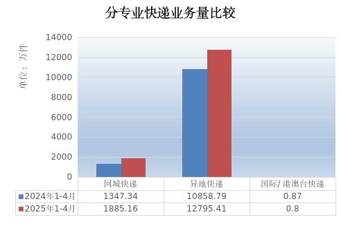 1-4月,同城业务量完成1885.16万件,同比增长39.92%;异地业务量完成12795.41万件,同比增长17.83%;国际及港澳台业务量完成0.80万件,同比下降8.86%。