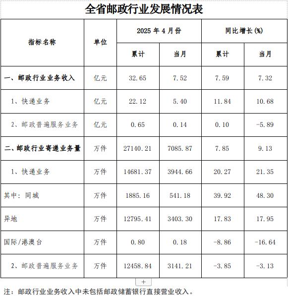 4月份,邮政行业业务收入(不包括邮政储蓄银行直接营业收入)完成7.52亿元,同比增长7.32%。其中,快递业务收入完成5.40亿元;同比增长10.68%。