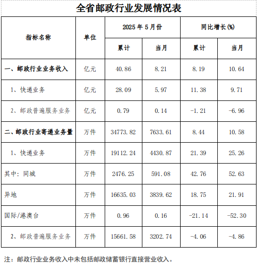 5月份,邮政行业业务收入(不包括邮政储蓄银行直接营业收入)完成8.21亿元,同比增长10.64%。其中,快递业务收入完成5.97亿元,同比增长9.71%。