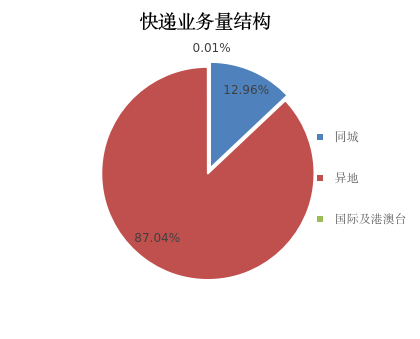 1-5月,同城、异地、国际及港澳台快递业务量分别占全部快递业务量的12.96%、87.04%和0.01%。